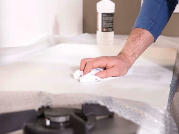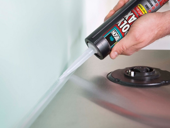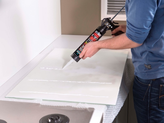 Местење на плочата : Нанесете Poly Max® во вертикални линии на секои 20 cm. Направете само вертикални линии за да спречите задржување на влагата и затоа пробивање на влажни места. Започнете ги и завршете ги линиите за лепило на приближно 5 cm од рабовите за да спречите Poly Max® да истекува од зад стаклената плоча.