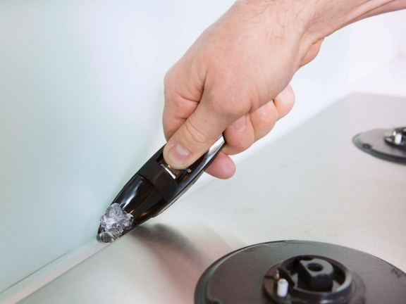 Запечатување на плочката против прскање: Работете од агол, со косата страна на млазницата насочена надолу.