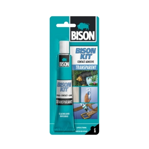Bison Kit® Transparent е супер силен, универзален контактен лепак на база на полиуретанска гума. Негова главна карактеристика е тоа што е кристално проѕирен и водоотпорен. Овозможува силно поврзување без видливи траги, правејќи го идеален за поправки и лепење на светли или тенки материјали.