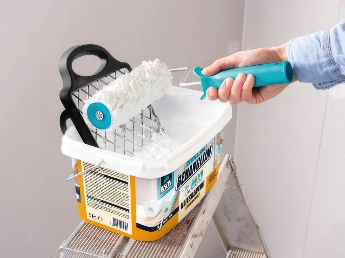 Постави ја рамката за нанесување лепак под агол во кофата и прицврсти ја под работ. Со помош на рамката рамномерно распредели го лепакот врз ролерот за неткаена тапета (fleece roller). Едноставно правило: рамномерен слој лепак = рамномерно залепена тапета. Нема филозофија, само прецизност.