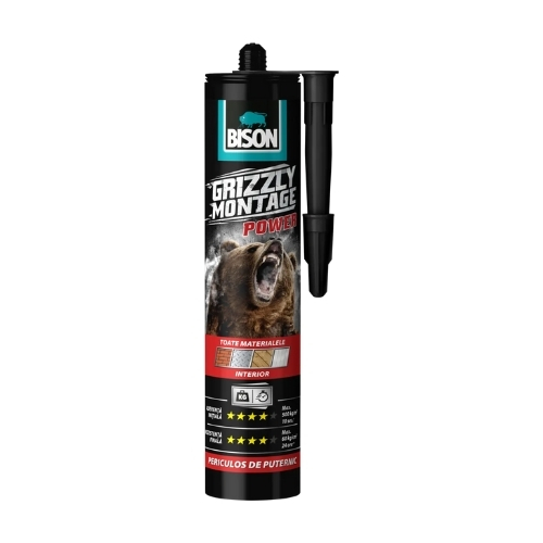 Bison Grizzly Montage® Power е универзален, супер силен и брз градежен лепак наменет за внатрешна употреба. Дизајниран е да обезбеди екстремно висока почетна сила на лепење (500 kg/m² за само 10 секунди) и висока крајна цврстина (60 kg/cm² по 24 часа). Идеален е за монтирање на сите видови предмети врз порозни површини.